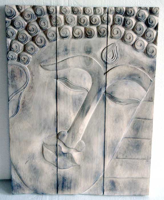 The image of Buddha hand-carved on wooden planks, in an antique `charcoaled` finish.